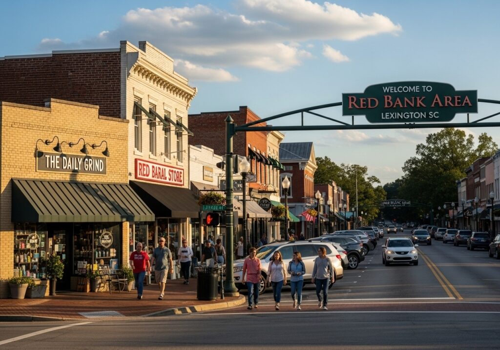 The Red Bank Area, located in southern Lexington, SC, is a rapidly growing suburban zone offering affordable family-friendly neighborhoods with amenities like pools and trails, convenient to Columbia commutes via major highways.