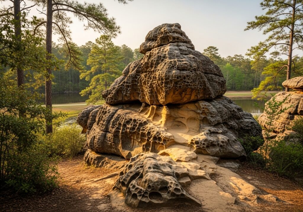 Well-defined trails lead through striking, otherworldly rock formations and diverse woodlands, offering hikers a chance to explore a small waterfall and the iconic inverted pyramid-shaped Peachtree Rock. This 460-acre preserve is managed for conservation and provides a peaceful setting for nature enthusiasts.