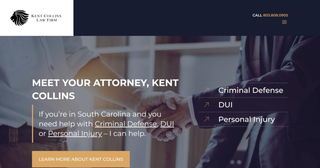 Kent Collins Law Firm, located in Lexington, SC, is dedicated to providing representation in various practice areas, including local and state criminal law, DUI defense, domestic violence, felony crimes, juvenile defense, and drug offenses. The firm was founded in 2007 and serves clients in Lexington, Columbia, Richland, Kershaw, and other areas in South Carolina.